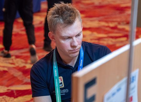 She cashed the [S]AK, came to hand with a diamond and played a heart to the queen. South won and played the [D]Q, forcing declarer to ruff. With only one entry to dummy she tried a heart to the ace, ruffed a heart and exited with a spade, but North won and exited with a club, South winning and cashing a diamond for one down – the only occasion across the four events on which fewer than 10 tricks were recorded.